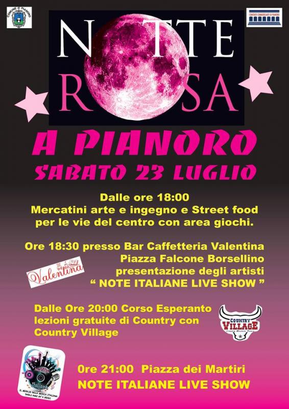 Notte Rosa a Pianoro. Sabato 23 luglio 2016, a partire dalle ore 15, per le vie del centro a Pianoro avrà luogo la Notte rosa: mercatino, gonfiabili, animazione, stand gastronomici.