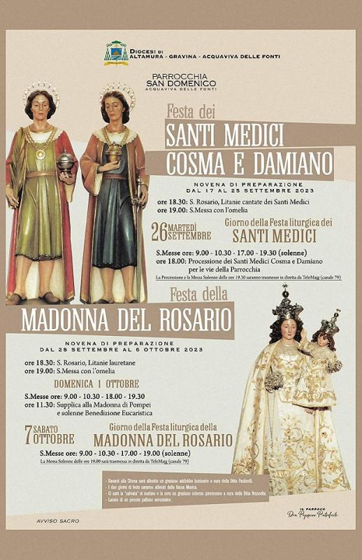 Ad Acquaviva delle Fonti in provincia di Bari si svolge nella giornata di Martedì 26 Settembre 2023 la Festa dei Santi Medici Cosma e Damiano, mentre nei giorni 01 e 07 Ottobre 2023 si festeggia la Madonna del Rosario.
