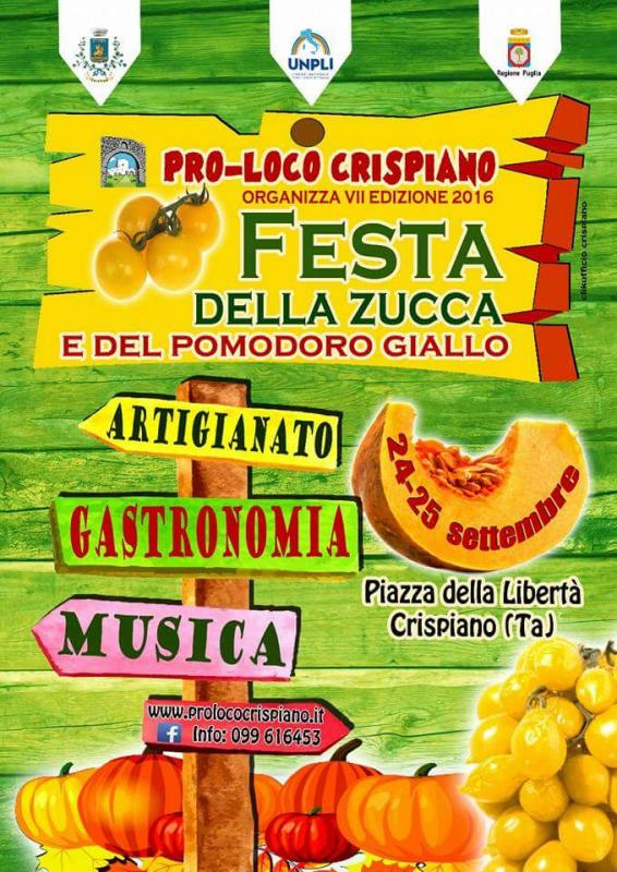 Pro-Loco Crispiano presenta l'edizione 2016 della Festa della zucca e del pomodoro giallo che si svolgerà il 24 e 25 settembre 2016.