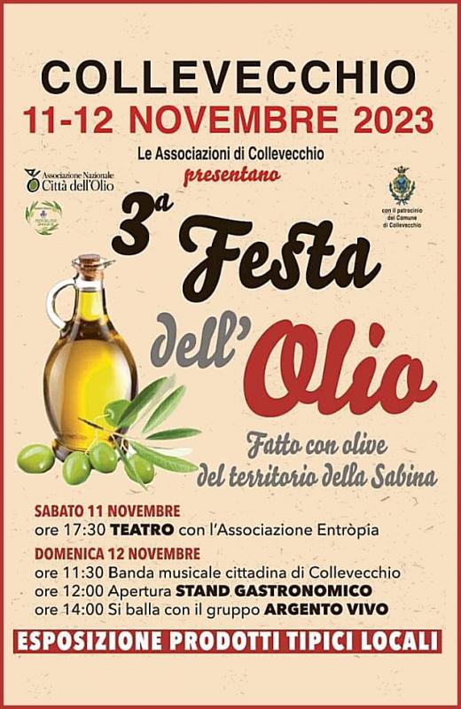A Collevecchio in provincia di Rieti si svolge nei giorni 11 e 12 Novembre 2023 la 3a edizione della Festa dell'Olio fatto con olive del territorio della Sabina.