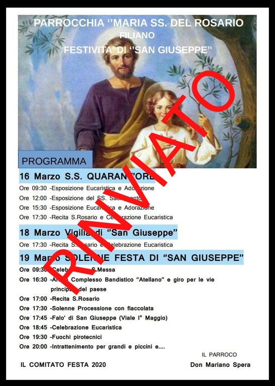 Il Comitato Festa di Filiano, in provincia di Potenza, comunica che la "Festa di San Giuseppe" prevista per il giorno 19 Marzo 2020 è rinviata a data da destinarsi.