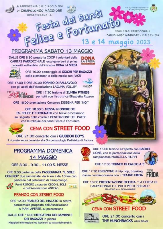 In occasione dei nostri Ss. Patroni Felice e Fortunato, la Parrocchia di Campolongo Maggiore e il Circolo Noi, in collaborazione con numerose associazioni del territorio, organizza due giorni (13 e 14 maggio) di iniziative per tutte le età!