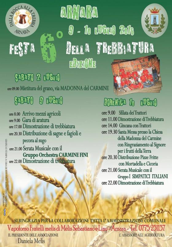 L'associazione culturale dalla Rocca alla Trebbia è lieta di presentare la 6° edizione Festa della trebbiatura di Arnara, localita Madonna del Carmine, il 9 e 10 luglio 2016.