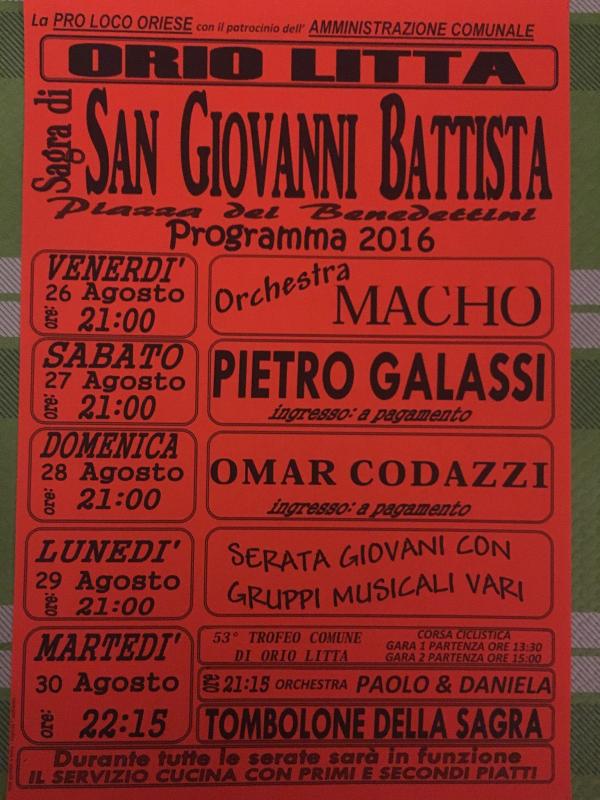 Come ogni anno Orio Litta è in festa con la tradizionale Sagra Patronale di San Giovanni Battista Martire che prevede eventi dal 26 agosto al 04 settembre 2016.