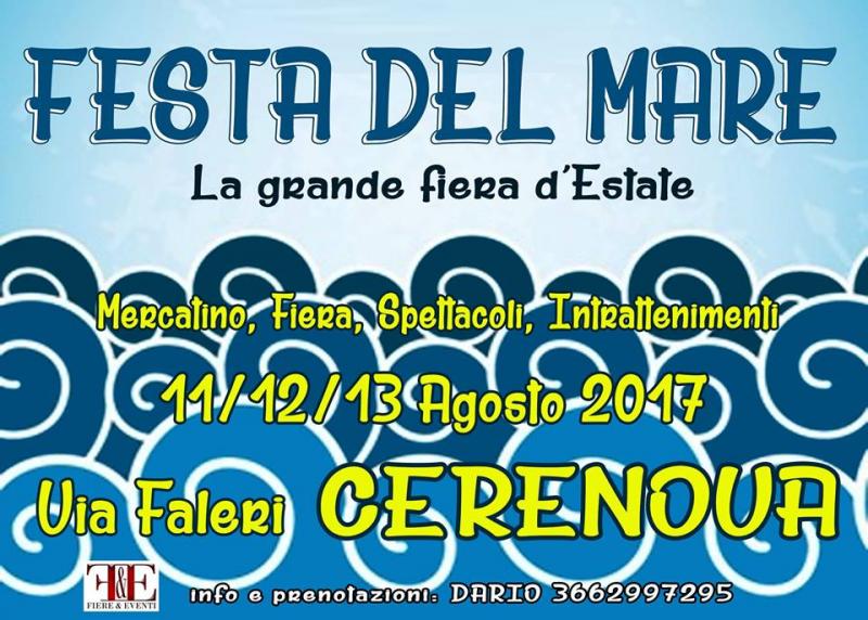 Come ogni anno da 30' anni a questa parte il centro di Cerenova verrà animato dalla storica Festa del Mare con mercatino, mercato commerciale, intrattenimenti, spettacoli e molto altro ancora Via Faleri sarà un punto di aggregazione per giovani e diversamente giovani o giovani di una volta i giorni 11-12-13 agosto 2017.