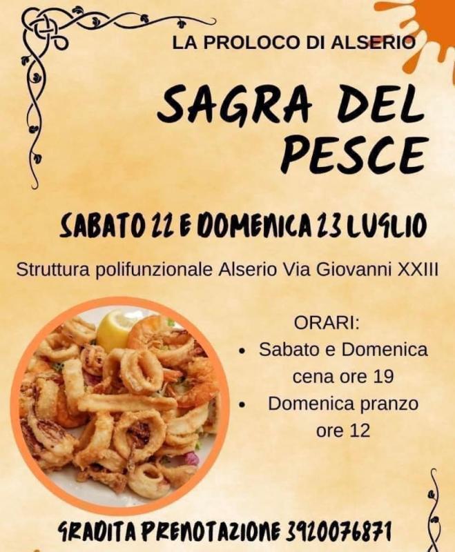 La Sagra del Pesce di Alserio si svolge quest'anno nei giorni 22 e 23 Luglio sabato solo a cena dalle 19:00 e domenica 23 luglio pranzo e cena,