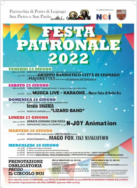 Sagra e Festa Patronale San Pietro e Paolo a Porto di Legnago nei giorni 24-25-26 Giugno 2022, stand gastronimici , luna park, giostre, pesca di beneficenza, serata giovani, intrattenimento musicale dal vivo,