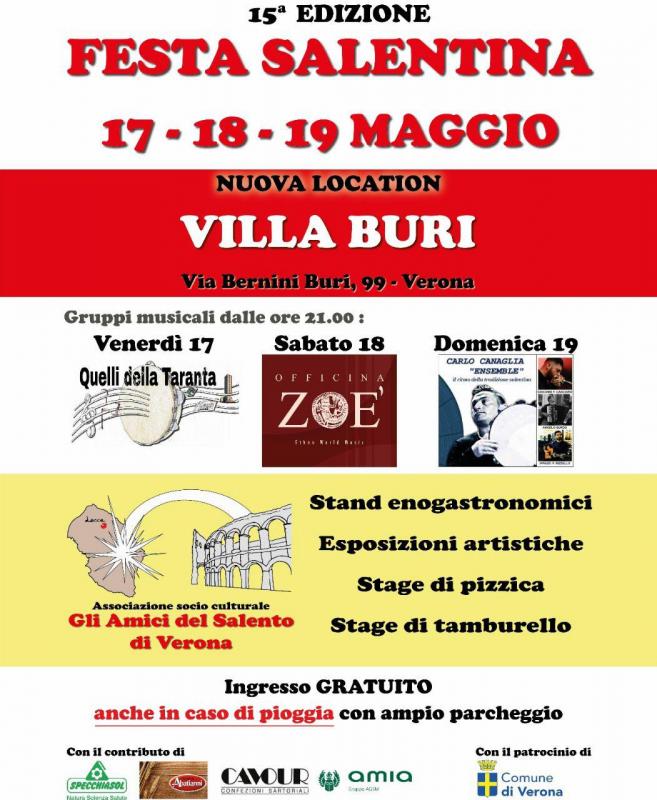 E’ tutto pronto per l’atteso appuntamento con la 15^ edizione della tradizionale Festa Salentina, che si svolgerà nei giorni 17 – 18 -19 Maggio 2019, presso la settecentesca VILLA BURI di VERONA – , con il patrocinio del Comune di Verona.