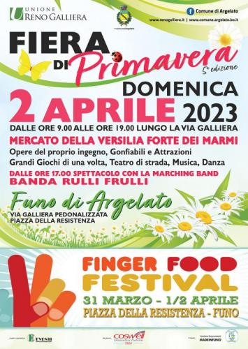 Domenica 2 Aprile 2023 per l'intera giornata, Funo chiude al traffico e si profuma di primavera: via libera a pedoni, passeggini, carrozzine e qualunque mezzo green lungo la via principale del paese che offre il suo spazio ai banchetti del Mercato della Versilia Forte dei Marmi con proposte di abbigliamento, calzature, e prodotti di pelletteria, ai banchetti dell'ingegno e della creatività con tante originali creazioni artigianali, infine i grandi giochi di una volta per i bambini e gli immancabili gonfiabili.