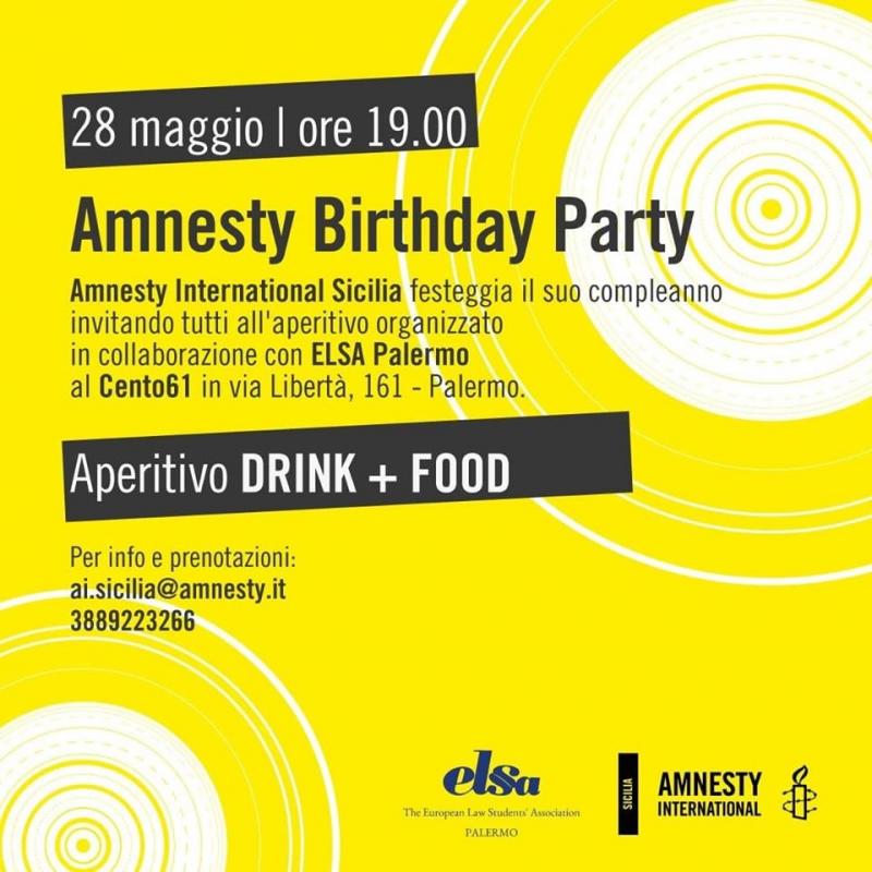 Amnesty International Sicilia festeggia il suo compleanno invitando tutti all'aperitivo organizzato in collaborazione con ELSA Palermo al Cento61 di via Libertà, 161.