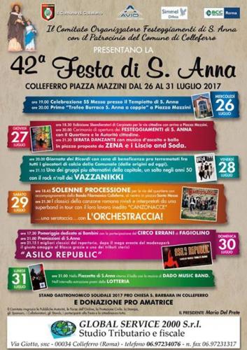 Il Comitato Organizzatore Festeggiamenti di Sant'Anna con il patrocinio del Comune di Colleferro presentano la 42^ Festa di Sant'Anna a Colleferro in Piazza Mazzini dal 26 al 31 Luglio 2017.