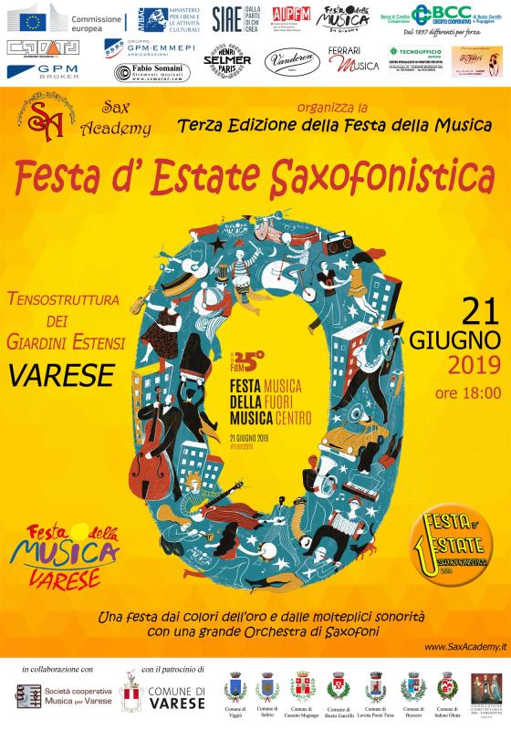 Anche quest'anno la Festa della Musica a Varese ha il colore dell’oro e l'eclettico suono del sax; infatti, sotto la direzione artistica del maestro Giuseppina Levato e con la collaborazione dei maestri Silvano Primon, Mattia Primon, Mauro Donadini, Mirco Garzonio ed Olivier Puget, il 21 giugno alle ore 18 con ingresso libero, si terrà la Terza Edizione della Festa d'Estate Saxofonistica presso la Tendostruttura dei Giardini Estensi di Varese.
