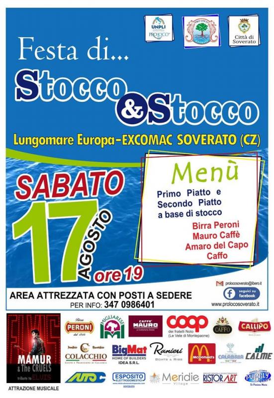 La Pro loco di Soverato promuove la Festa dello Stocco. Un menù ricco di pietanza tipiche a base di pesce stocco al fine di valorizzare le tradizioni culinarie locali. Vi aspettiamo numerosi nei locali dell'EX-COMAC vicino al lungomare Europa, per trascorrere una piacevole serata assieme e degustare tra gli altri un primo piatto speciale