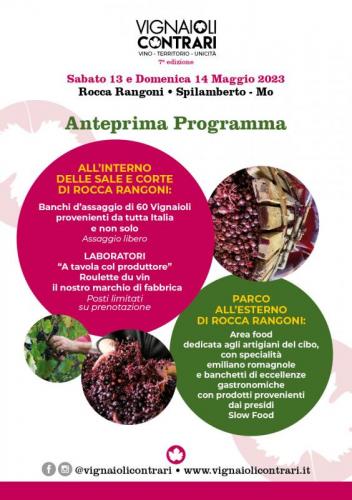 Giunta alla Ottava Edizione nelle giornate di Sabato 11 e Domenica 12 Maggio, nella splendida cornice della Rocca Rangoni, edificio Medievale nel centro storico di Spilamberto (MO), la manifestazione Vignaioli Contrari si presenta come un momento di incontro e di degustazione dei vini artigianali da vitigni autoctoni: ospita più di 65 produttori provenienti da tutta Italia e alcuni Paesi Europei . Saranno direttamente i produttori, presenti dietro i loro banchi, a parlare al pubblico dei loro vini. Sarà così possibile degustare più di 350 etichette, ognuna delle quali verrà raccontata direttamente dal vignaiolo che ne ha curato tutta la produzione. La scelta di selezionare accuratamente le cantine partecipanti ha da sempre contraddistinto il tenore della manifestazione, elevando sempre di più la qualità dei vini che si potranno degustare.