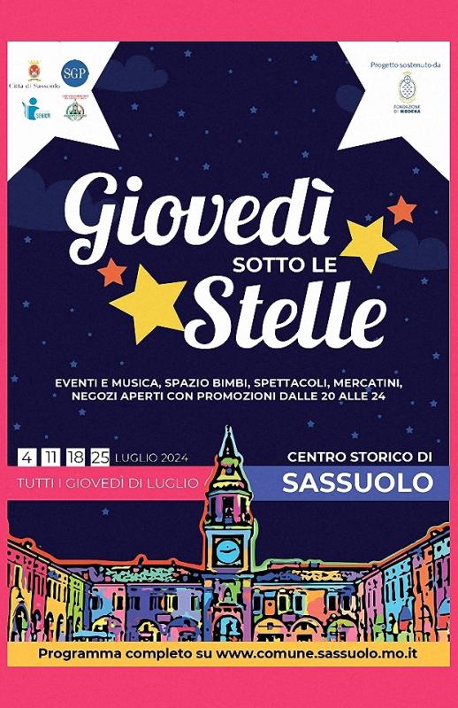 Come ogni anno, la kermesse estiva dei Giovedì sotto le Stelle offre, nelle serate dei giovedì di luglio, negozi aperti con promozioni, eventi, spettacoli e mercatini dalle ore 20 alle ore 24. Il Comitato dei Commercianti del Centro Storico e tantissime associazioni, circoli e parrocchie animano il centro storico di Sassuolo con il patrocinio dall’Amministrazione Comunale e la collaborazione di Sgp.