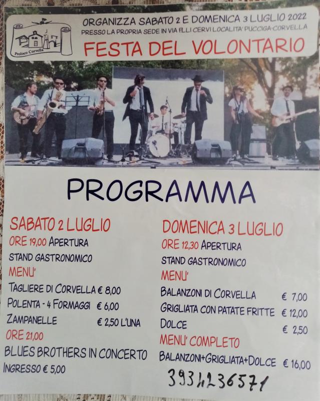 Festa del Volontariato a Corvella nei giorni 2 e 3 Luglio 2022 organizzata dalla pro loco corvella presso la propria sede in via F.lli Cervi in localita Pucciga-Corvella,