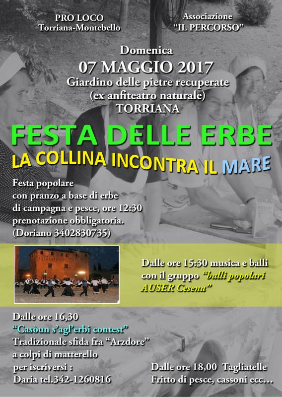Domenica 7 maggio presso il Giardino delle pietre recuperate di Torriana torna la tradizionale "Festa delle erbe, la collina incontra il mare", la festa popolare con pranzo a base di erbe di campagna e pesce, a cura della Pro Loco Torriana-Montebello e dell' Associazione "Il Percorso".