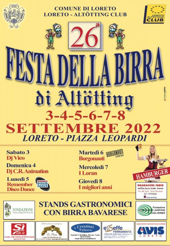 Festa della Birra a Loreto in Piazza Leopardi si svolge nei giorni 3-4-5-6-7-8 Settembre 2022, tutte le sere stand gastronomici e birra bavarese e musica.