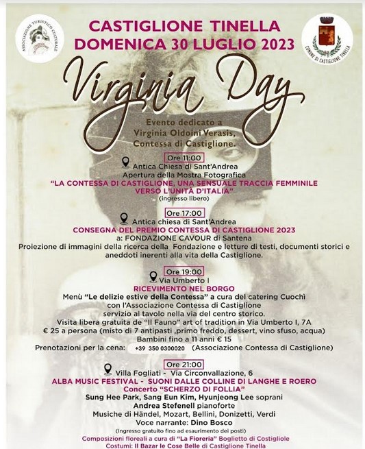 Domenica 30 luglio Castiglione Tinella torna a celebrare Virginia Oldoini Verasis meglio nota come la Contessa di Castiglione. Ogni anno infatti, l’ultima domenica di luglio, attraverso il Virginia Day si riaggancia la storia e il ricordo dell’immortale fascino di questo personaggio femminile, protagonista della scena politica e storica, della fotografia e del costume nella seconda metà del diciannovesimo secolo.