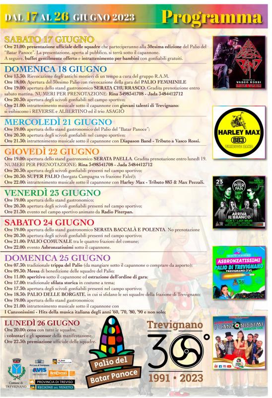 Ore 13.30: Rievocazione degli antichi mestieri un tempo a cura del gruppo R.A.M. Ore 18.00: Apertura del 30esimo Palio con rievocazione della gara del PALIO FEMMINILE Ore 19.00: apertura dello stand gastronomico SERATA CHURRASCO. Gradita prenotazione entro sabato mattina. NUMERI PER PRENOTAZIONE: Rina 3498341708 - Jada 3484412712 Ore 20.30: apertura degli scivoli gonfiabili nel campo sportivo; Ore 21.00: intrattenimento musicale sotto il capannone con giovani talenti di Trevignano: si esibiscono i REVERSE e ALBERTINO ed il trio ASAGIÒ