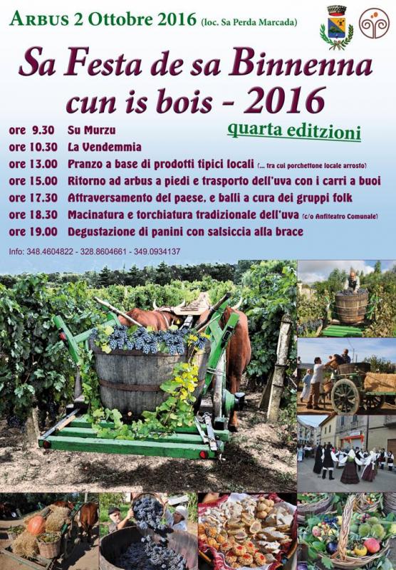 Domenica 2 ottobre 2016 Sa Fest'è sa Binnenna cun is bois, Festa della vendemmia ad Arbus, manifestazione identitaria e tradizionale finalizzata a valorizzare la tradizione vitivinicola e quella millenaria dei carri a buoi.