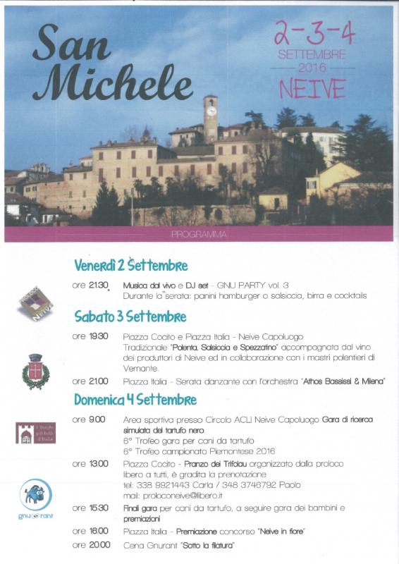 Ritorna puntuale a Neive l’appuntamento con la tradizionale Festa di San Michele che si sviluppa nei primi giorni di settembre attraverso diversi eventi, coinvolgendo il centro storico ed anche il centro sportivo a Borgonuovo. La festa ha inizio venerdì 2 settembre alle ore 21.30 con una serata particolarmente dedicata ai giovani, animata da musica dal vivo e DJ set con GNU PARTY vol.3 e possibilità di gustare panini, hamburger, salsiccia, birra e cocktails. Sabato 3 settembre, dalle ore 19.30 nel centro storico saranno protagonisti i Mastri Polentieri di Vernante per la tradizionale cena “Polenta, Salsiccia e Spezzatino” “innaffiata” dai vini dei produttori neivesi, mentre l’orchestra “Athos Bassissi & Milena” offriranno musica per la serata danzante.