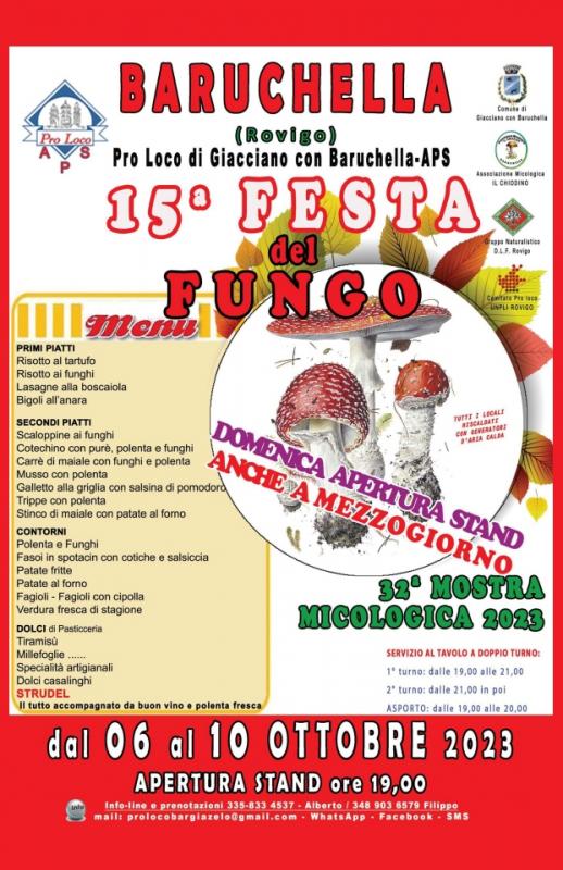 La Pro Loco di Giacciano con Baruchella - APS è pronta con la 15a Festa del Fungo - 32a Mostra micologica di interesse nazionale, in collaborazione con i Gruppo Micologico "IL CHIODINO". Vi aspettiamo dal 06 al 10 Ottobre 2023 - Si ricorda che i locali sono riscaldati. Ampio parcheggio a disposizione. Seguiteci sui social... Possibilità di chiamare per la prenotazione del tavolo, che non obbligatoria, ma consigliata per trovare il Vs posto riservato.