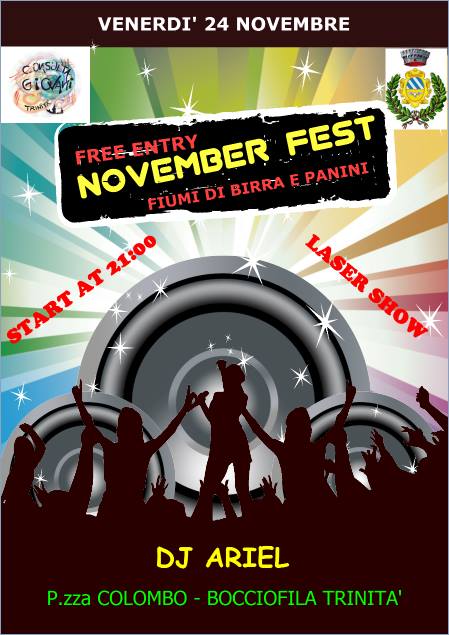 Venerdì 24 novembre 2017 in occasione della 13^ edizione della Fera dij pocio e dij bigat la Consulta Giovani organizza per le ore 22,00 presso la bocciofila trinitese "NOVEMBER FEST".
