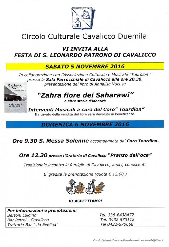 Nella serata di sabato 5 novembre, dalle ore 20:30, la Sala Parrocchiale di Cavalicco ospiterà la presentazione del libro “Zahra fiore dei Saharawi e altre storie di identità” di Annalisa Vucusa, allietata da interventi musicali a cura del Coro "Tourdion"; il ricavato della vendita del libro verrà devoluto in beneficenza.
