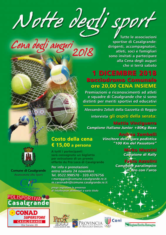 Sabato 1 dicembre alle ore 20, presso il Bocciodromo di Casalgrande, il Comune di Casalgrande organizza l’undicesima edizione de “Notte degli sport”, una serata dedicata alle associazioni e ai gruppi sportivi del territorio, agli atleti e alle loro famiglie, ai dirigenti e agli accompagnatori nonché a tutti coloro che vorranno partecipare.