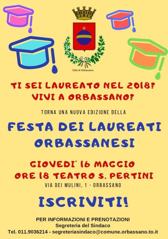 Tutti i giovani residenti a Orbassano e che abbiano conseguito la Laurea nel corso del 2018 sono invitati a partecipare alla undicesima edizione della “Festa dei Laureati”, che avrà luogo GIOVEDI’ 16 MAGGIO alle ore 18 presso la Sala Teatro S. Pertini – via Mulini 1.