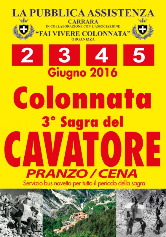 Festa del Cavatore 2016. Come ormai da 3 anni a questa parte la Pubblica Assistenza Carrara organizzaerà la sagra del cavatore a Colonnata. La manifestazione che si terrà nel paese del marmo e del lardo sarà aperta dal 2 Giugno al 5 Giugno sia a PRANZO che a CENA. Tutte le sere musica con karaoke.