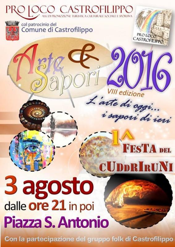 Arte & Sapori 2016: tutto pronto per la ottava edizione dell’Arte da vedere e da gustare, ma non solo…1^ Festa del Cuddriruni Si terra giorno 3 agosto p. v. dalle ore 21 in poi in piazza Sant’Antonio Abate, nei pressi dell’omonimo santuario, l’ottava edizione di Arte & Sapori, importante manifestazione culturale e di promozione sociale che coniuga le opere d’arti visive con quelle culinarie. Inserita all’interno delle manifestazioni estive 2016 promosse dal Comune di Castrofilippo, la Pro Loco Castrofilippo rende omaggio alla sua terra attraverso la valorizzazione e la promozione di ogni talento insito nell’essere umano, spaziando dalle creazioni artistiche alle arti visive con l’esposizione di materiale pittorico, scultoreo e non solo, il tutto intercalato dalle prelibatezze culinarie preparate dai nostri ristoratori che costituiscono il fiore all’occhiello del nostro paese.
