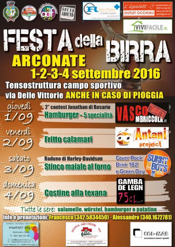 Terza edizione della Festa della Birra di Arconate: 4 giorni di birra, musica e divertimento. Ogni sera specialità in cucina, sempre attivo servizio salamelle, patatine, hot-dog e hamburger. Speciale angolo cocktail.