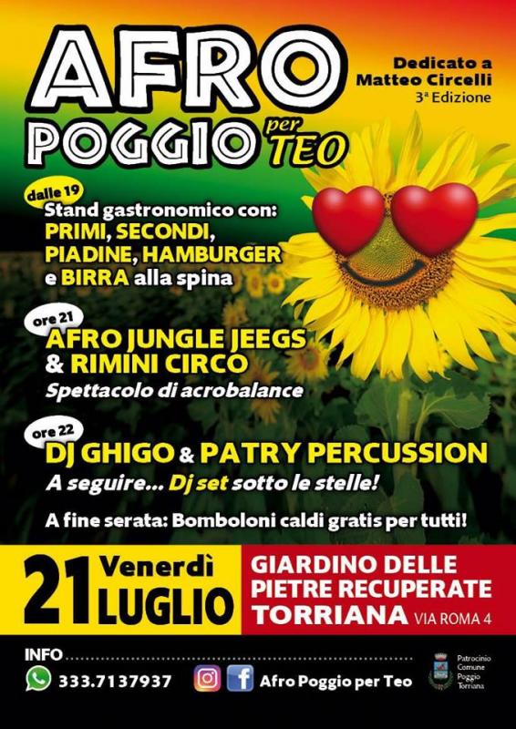 Venerdì 21 luglio nell'anfiteatro di Torriana torna la terza edizione di Afro Poggio per Teo, la festa dedicata a Matteo Circelli, in occasione di quello che sarebbe stato il suo 21° compleanno.