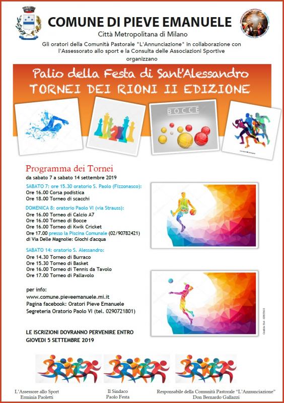 Il Palio è organizzato dalla Consulta dello Sport con gli oratori di Pieve Emanuele e si svolgerà dal 07 al 14 Settembre.