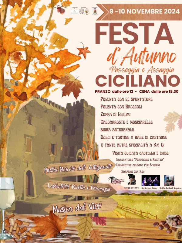 La "Festa d'Autunno 2024 - Passeggia e Assaggia" a Ciciliano vi nel pittoresco borgo vecchio, regalando ai visitatori un'esperienza autentica tra le tradizioni contadine locali. L'evento si distingue per la combinazione di sapori, cultura e divertimento, creando un'atmosfera calda e accogliente tipica dell'autunno delle nostre terre.