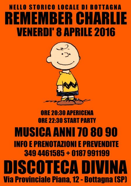 Londra Notturna Staff presenta "Remember Charlie Brown" alla discoteca Divina di Bottagna (SP), venerdì 8 aprile 2016, un ritorno al passato nello storico locale dove si ballerà solo la migliore musica dance degli anni '70, '80 e '90.