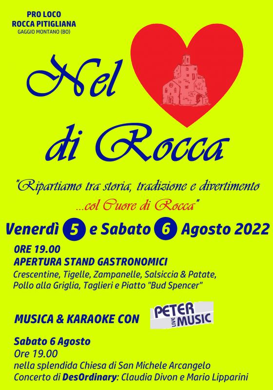Teatro della festa sarà la splendida cornice della piazza della Chiesa di Rocca Pitigliana, il nostro Borgo, frazione di Gaggio Montano (BO) dove dalle ore:19.00 Apriranno gli stand gastronomici
