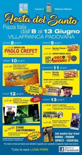 Tradizionale FESTA DEL SANTO PATRONO "Sant'Antonio" Dal 8 al 13 giugno 2023 a Villafranca Padovana dalle ore 19.00 fino alle 24.00.