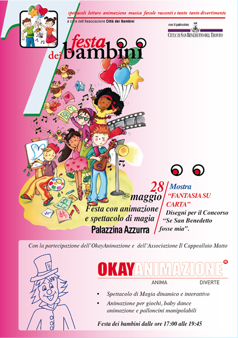 La Festa dei bambini è un grande evento culturale promosso dall’Associazione Città dei Bambini e patrocinato dall’amministrazione comunale di San Benedetto del Tronto, ed è rivolto alle bambine, ai bambini, alle giovane e ai giovani dai zero ai 100 anni. Dedicato al mondo della scuola, al turismo, alle famiglie e a tutti quelli che amano la cultura e i linguaggi delle arti.