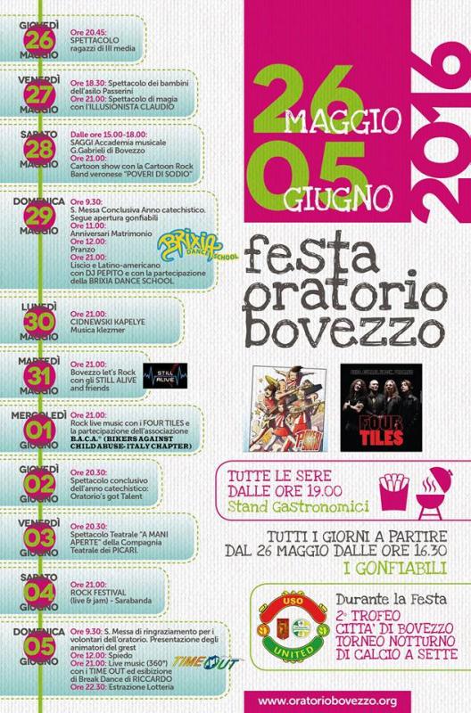Ore 21.00: Rock live music con i FOUR TILES e la partecipazione dell’associazione B.A.C.A. (BIKERS AGAINST CHILD ABUSE- ITALY CHAPTER)