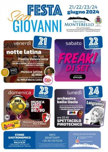 La Festa di San Giovanni si svolge dal 21 al 24 Giugno 2024 presso gli impianti sportivi P.le del Donatore a Montebello Vicentino.