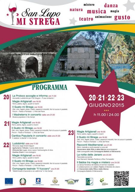 Si parte sabato 20 giugno: in mattinata la Pro Loco di San Lupo accoglierà i primi visitatori e raccoglierà le adesioni dei bambini per la partecipazione all’evento “Ludobimbi”, in calendario per il giorno 22 giugno. Alle ore 19.00, saranno inaugurati due percorsi “Il Gusto Mi Strega” e “Magia Artigiana” con stand e iniziative a tema; in serata, in via Campi, I Madreterra in concerto, musica e canti della tradizione popolare e, direttamente dalla “Orchestra Italiana” di Renzo Arbore, ospite speciale della serata Peppe Sannino.
