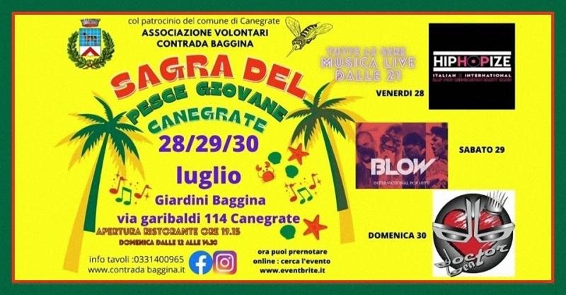 La nuova edizione della Festa del Pesce Giovane a Canegrate (MI), organizzata dalla Contrada Baggina, si svolge dal 28 al 30 Luglio 2023.