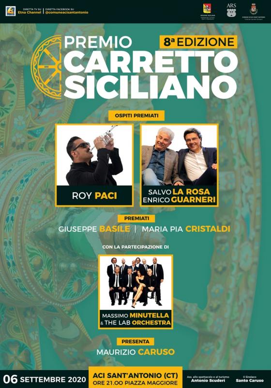 E’ tutto pronto ad Aci Sant’Antonio per l’ottava edizione del “Premio Carretto Siciliano”, in programma il 6 settembre, alle ore 21, nella centralissima piazza Maggiore. L’attesa manifestazione, organizzata dal Comune di Aci Sant’Antonio con la direzione artistica di Mario Russo, assegna ogni anno riconoscimenti ai siciliani che si sono distinti ciascuno nel proprio campo, dall’arte alla musica, dalla letteratura allo sport, dall’imprenditoria alle scienze. Tanti i nomi illustri premiati nelle passate edizioni con la caratteristica miniatura di ruota di carretto siciliano su pietra lavica: su tutti Lello Analfino, frontman dei Tinturia; il giornalista Pietrangelo Buttafuoco; l’attore comico Nino Frassica; la cantante Antonella Ruggiero; il duo comico de I Soldi Spicci; il cantante Mario Incudine; gli storici pupari F.lli Napoli; il cantautore Giovanni Caccamo e l’attore comico Roberto Lipari. Ma anche questa ottava edizione non sarà da meno. A ricevere il premio saranno, infatti, Roy Paci, virtuoso musicista e cantante dall’anima jazz, che si esibirà accompagnato dai Massimo Minutella & The Lab Orchestra; Enrico Guarneri, attore versatile dalle grandi doti interpretative; Salvo La Rosa, giornalista e storico conduttore televisivo; la pittrice Maria Pia Cristaldi e l’imprenditore santantonese Giuseppe Basile. Anche quest’anno la conduzione della serata sarà affidata a Maurizio Caruso.