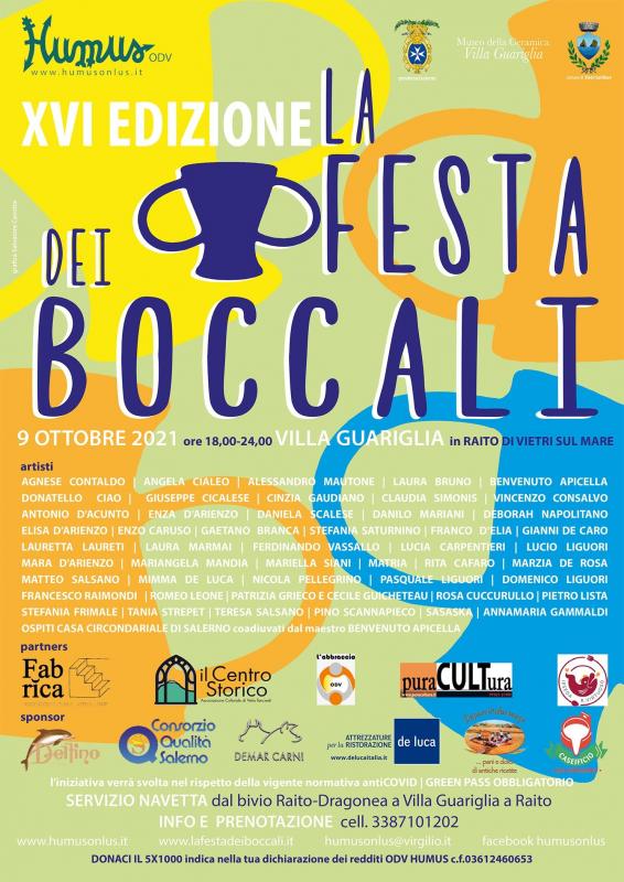 Sabato 9 settembre 2021, alle ore 18,00, taglio del nastro per la XVI edizione "La Festa dei Boccali", evento artistico ed enogastronomico organizzato dall’Associazione di volontariato Humus Onlus, presieduta da Lauretta Laureti. Humus Onlus da più di 21 anni si occupa di promuovere l'arte della ceramica come strumento di solidarietà e crescita culturale, comunicazione e aggregazione, promozione e integrazione sociale. La location è quella di sempre, Villa Guariglia a Raito di Vietri sul Mare, sospesa fra mare e cielo, che ogni anno attira numerosissimi appassionati di ceramica e di arte, collezionisti, curiosi. Alla Festa dei Boccali si incontreranno anche nuovi e vecchi artisti, disabili, volontari e simpatizzanti della manifestazione, stigmatizzando, con la loro presenza attiva, l’importanza e il valore dell’agire volontario. Sono 50 gli artisti coinvolti nella manifestazione e 500 i boccali realizzati in ceramica, attraverso la cui vendita si rinnova un gesto solidale, in cui l'arte diventa anche strumento di aggregazione, sostegno e crescita sociale: con il ricavato l’Associazione di volontariato Humus Onlus potrà continuare a dedicarsi a disabili ed anziani, molti dei quali hanno trovato nella ceramica una potenzialità espressiva. Tra i boccali in vendita anche quelli realizzati dagli ospiti della casa circondariale di Salerno, coadiuvati dal maestro Benvenuto Apicella. I boccali saranno usati per degustare il vino che accompagnerà i piatti della tradizione culinaria salernitana, a cura degli allievi dell’Istituto professionale alberghiero "R. Virtuoso" di Salerno.