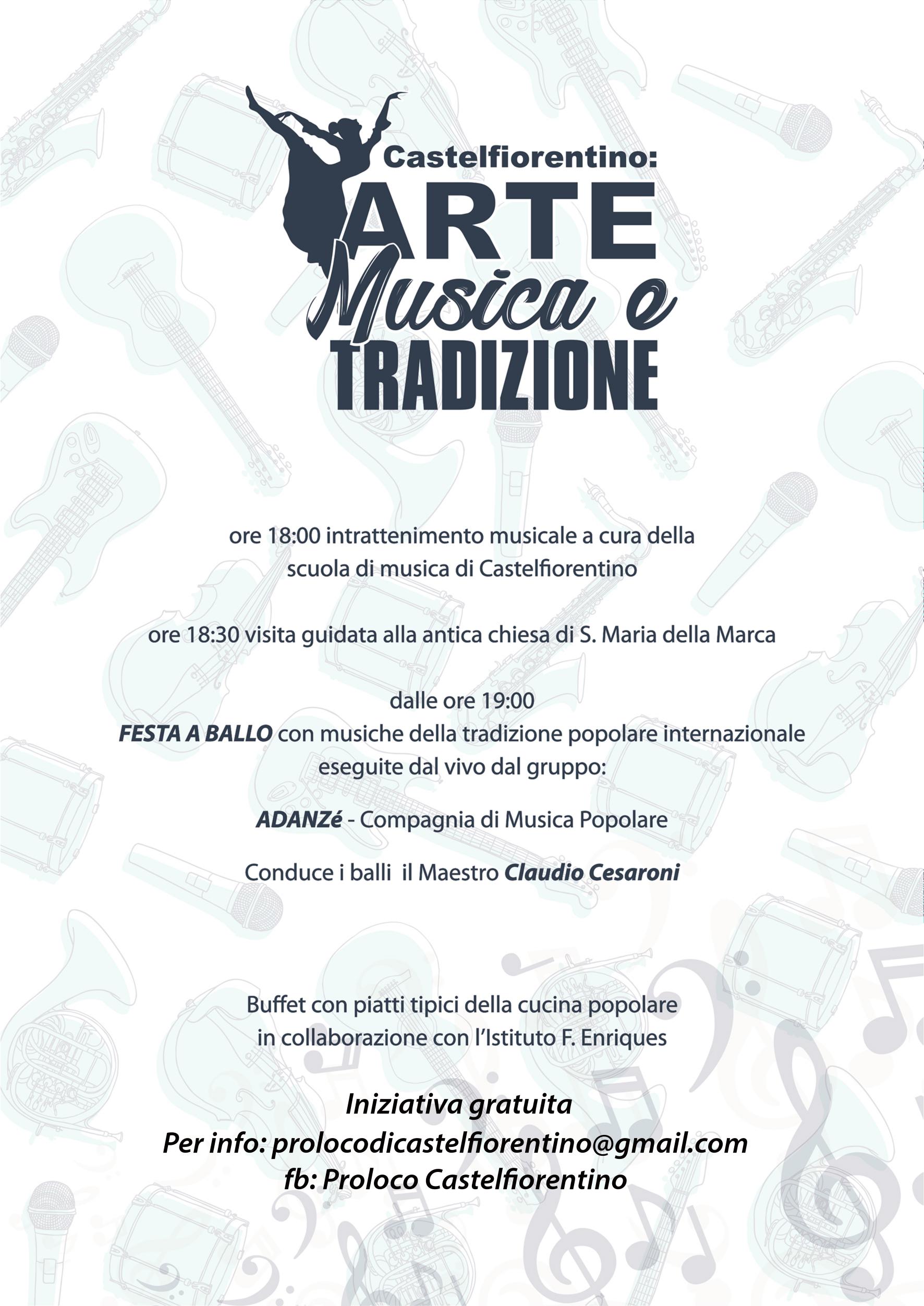 Francesco Marchetti aprirà l'evento con un'esibizione canora, accompagnato dalle note della pianista Pamela Burrini; si prosegue, dalle ore 19.00, con "Festa a Ballo", con danze e musiche popolari del repertorio italiano e internazionale. A guidare la compagnia ADANZé sarà il maestro di ballo Claudio Cesaroni.