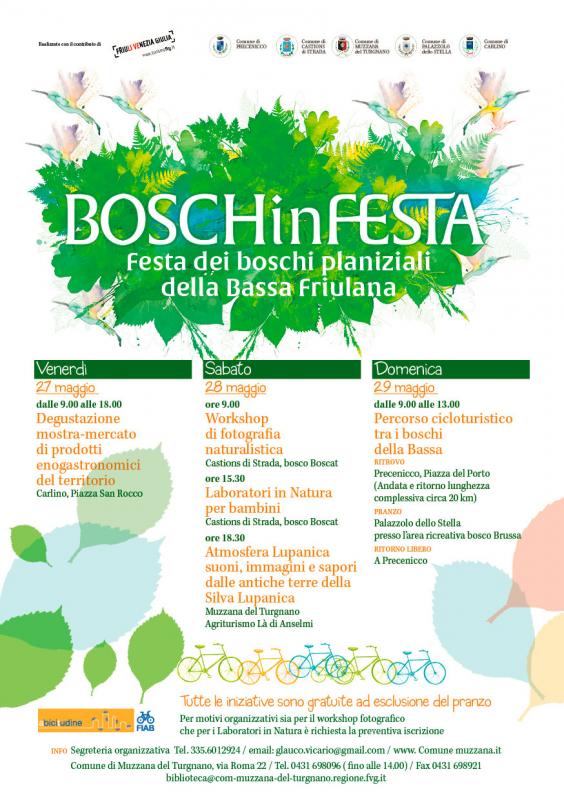 La festa si apre a Carlino venerdì 27 maggio, alle ore 9, in piazza San Rocco con la mostra-mercato e la degustazione di prodotti eno-gastronomici del territorio. Sabato 28 maggio, dalle 9 in poi, nel bosco Boscat di Castions di Strada si terrà il workshop di fotografia naturalistica: i partecipanti potranno catturare dettagli della flora e della fauna degli ultimi esempi di foreste della pianura padana, 600 ettari che racchiudono tremila anni di storia. Il pomeriggio è dedicato ai bambini: dalle 15.30, sempre nel bosco Boscat, sperimenteranno nei "Laboratori in Natura" la possibilità di incrociare animali selvatici come i caprioli, di avvistare specie di anfibi e di uccelli della vicina laguna, sia stanziali sia di passaggio nella loro migrazione, rapaci diurni come il nibbio bruno o il falco picchiaiolo.