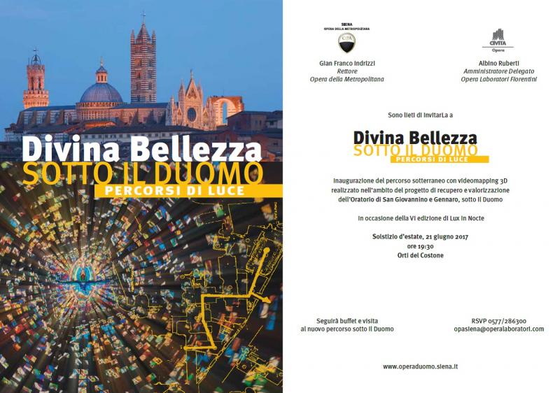 L’appuntamento è per mercoledì 21 giugno alle 19.30 presso gli Orti del Costone dove tutta la cittadinanza è invitata: “Divina Bellezza – Sotto il Duomo, percorsi di Luce”, un progetto attraverso il quale l’Opera intende recuperare e valorizzare l’Oratorio ormai da decenni chiuso al pubblico. Il percorso inizia dal Battistero e prosegue negli ambienti frutto delle modifiche della Cattedrale iniziate nel 1317. Attraverso le fondamenta del braccio sinistro del transetto, si giunge all’aula seicentesca della chiesa. I visitatori, raggiunto il cantiere dell’Oratorio, assisteranno ad uno spettacolo immersivo della storia, dell’arte e delle tradizioni di Siena grazie a una proiezione di videomapping 3d con cuffia in multilingua. L’Opera della Metropolitana e Opera Civita offriranno, durante la serata, un aperitivo di benvenuto con interventi musicali di Radio 5 Siena e spettacoli di luce dell’Accademia Creativa Artisti di Strada.